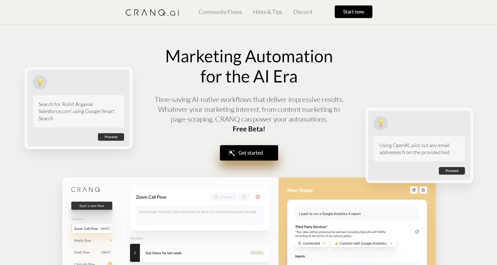 Revolutionize your marketing workflows with Cranq AI, the avant-garde marketing automation platform that seamlessly integrates AI-native workflows to maximize efficiency and outcomes. From content creation to data scraping, Cranq AI empowers you with time-saving, AI-driven processes designed to amplify your marketing efforts. Whether you're delving into content marketing or seeking to streamline your digital operations, Cranq AI's intuitive platform offers a robust suite of tools to enhance your productivity and effectiveness. Embrace the future of marketing with Cranq AI and unlock the full potential of your strategies today. For more in-depth information, you can explore their offerings directly at Cranq AI.