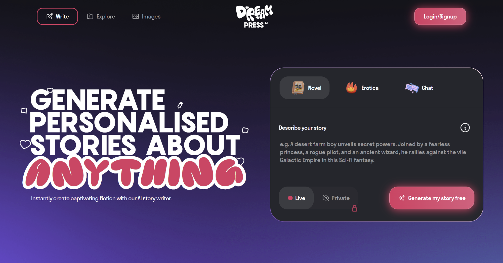 Dreampress AI is an interactive AI platform that provides the user with a space to humanly and creatively pen down effortless, unique, and compelling stories. Whether you are an aspiring writer or a fanatical hobbyist, Dreampress AI has all the tools to craft a winning story that captivates and inspires. This simple tool suits precisely those authors who want to turn simple ideas into complex tales. Begin exploring more and let your storytelling journey begin at Dreampress AI.