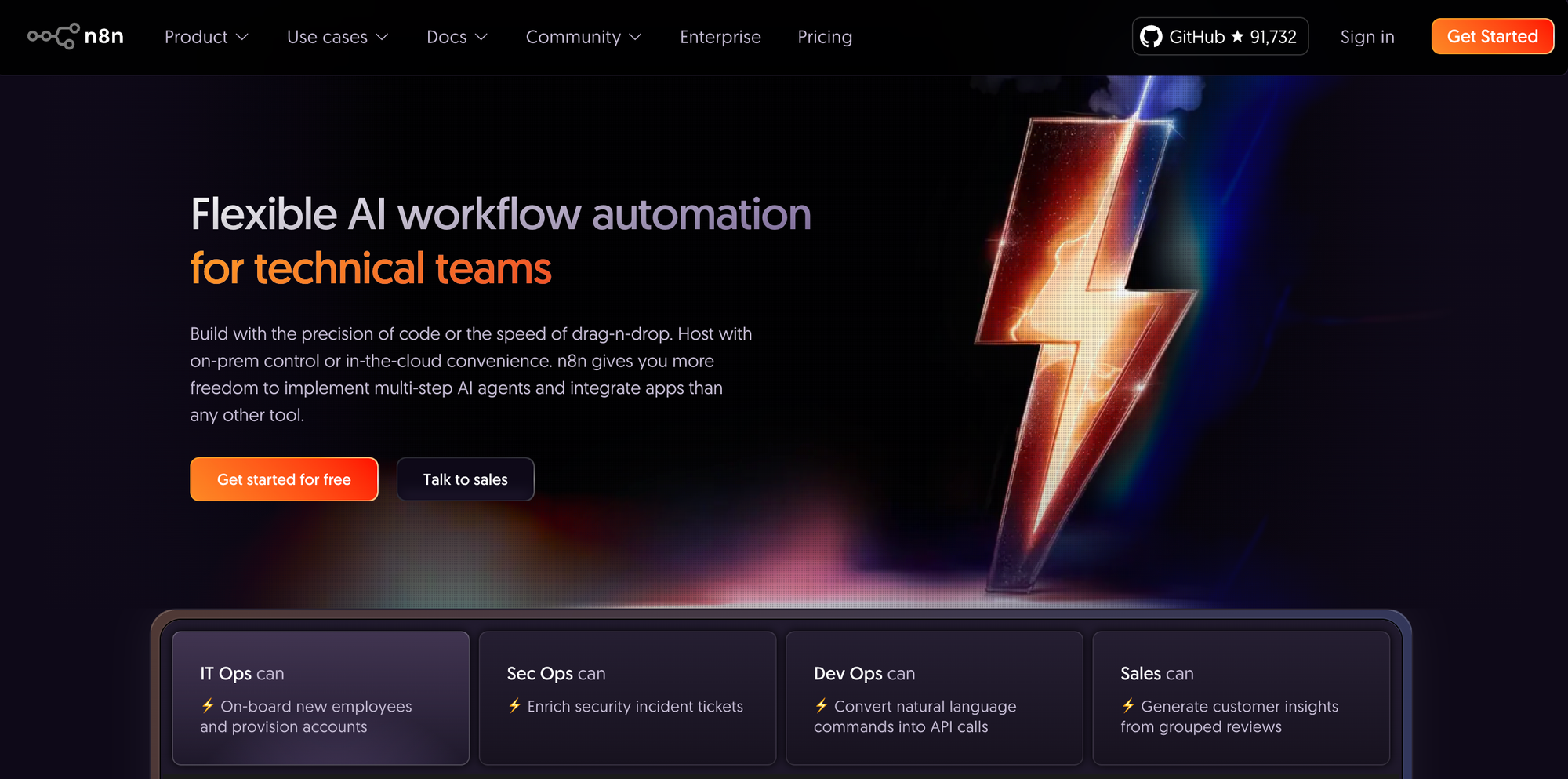 n8n is a powerful workflow automation platform that lets you build custom automations using a visual interface or code. With over 500 integrations and native AI support, it helps technical teams connect apps, automate tasks, and create multi-step workflows fast. You can self-host or use the cloud version, giving you full control over your data and deployments. Whether you're building simple automations or complex AI agents, n8n adapts to your needs.