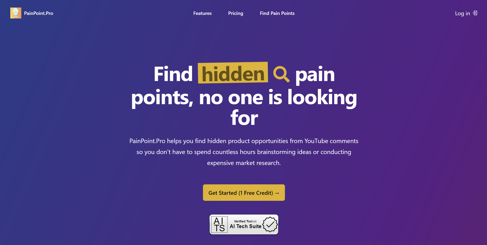 PainPoint.Pro provides a unique service by analyzing YouTube comments to uncover hidden product opportunities, streamlining the market research process. This tool is ideal for entrepreneurs and businesses seeking to identify unmet needs without extensive time investment or research costs. Discover more about how PainPoint.Pro can assist in pinpointing potential market gaps at PainPoint.Pro.
