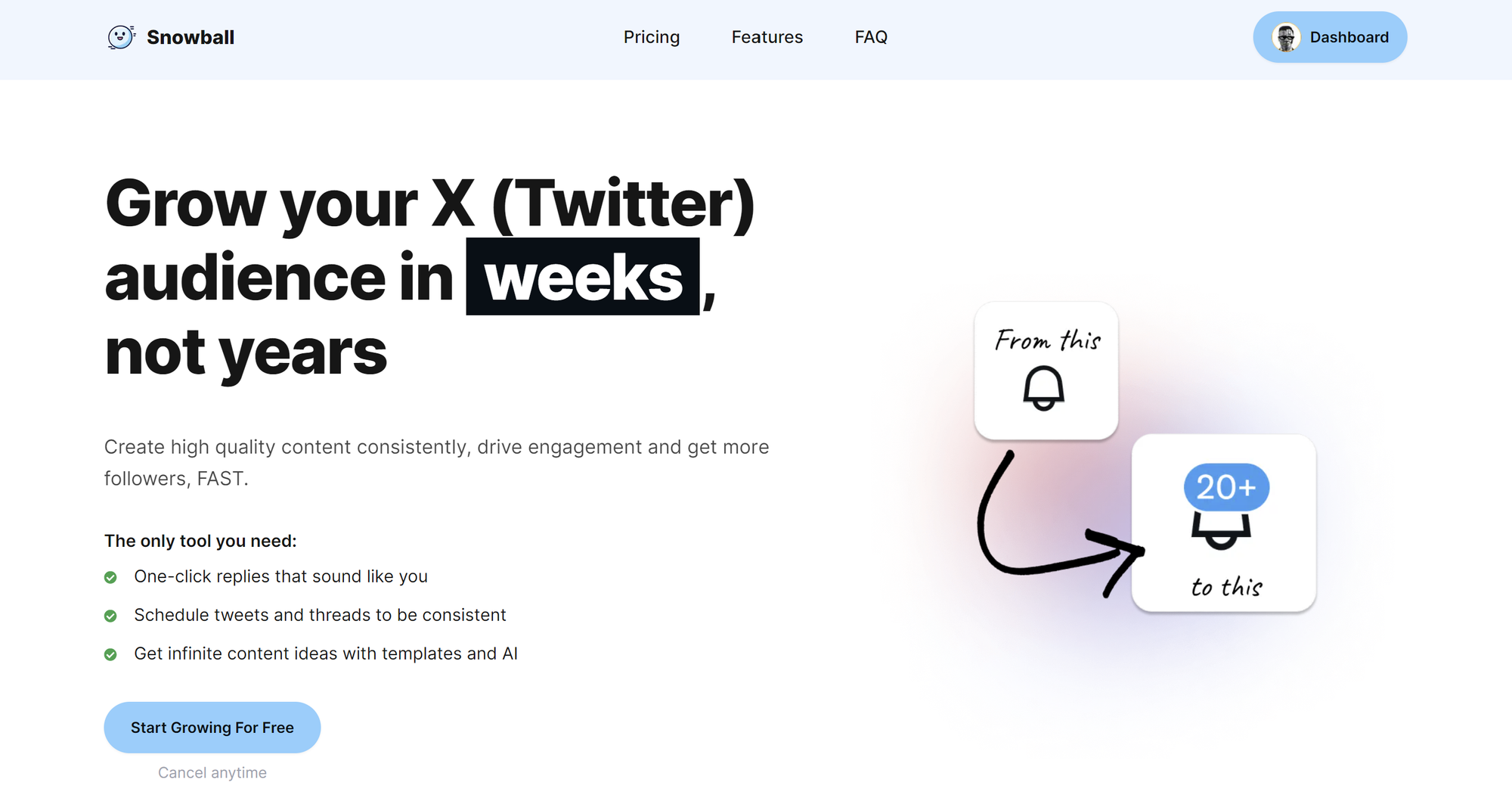 Snowball is a versatile tool designed to help X (Twitter) users rapidly increase their following by creating high-quality, engaging content effortlessly. It features tools like one-click replies, tweet scheduling, and infinite content ideas generated by AI, making it perfect for brands and creators aiming to grow their audience efficiently. Snowball ensures consistent, quality engagement with your network. Learn more and start enhancing your X (Twitter) presence at Snowball.