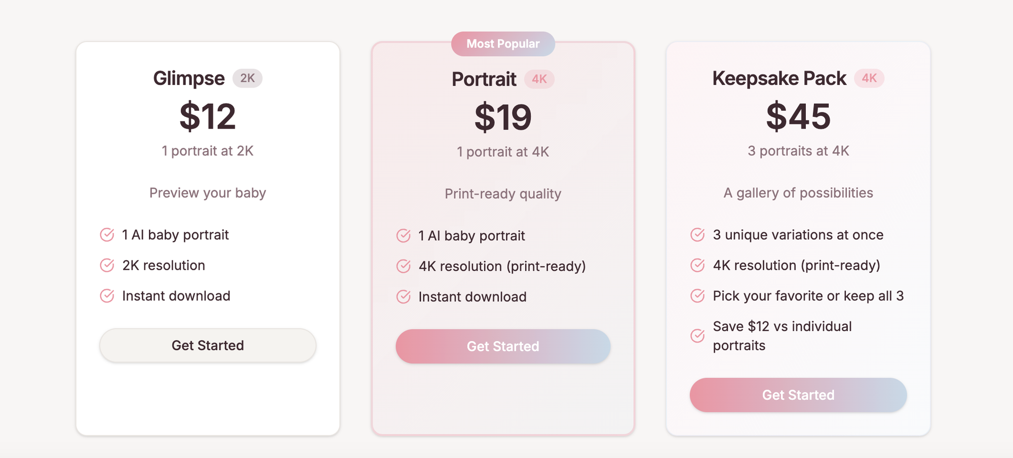 Most parents go with either the single 4K portrait or the keepsake pack. The 2K option is really just for testing it out.