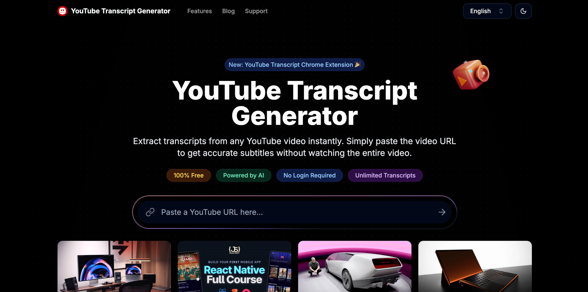 YouTube Transcript Generator is a free AI tool that instantly converts any YouTube video into a full, searchable transcript. Just paste the video URL to extract accurate subtitles without watching the entire video. No login required, unlimited transcripts, and multiple download formats make it perfect for content creators, students, and researchers.